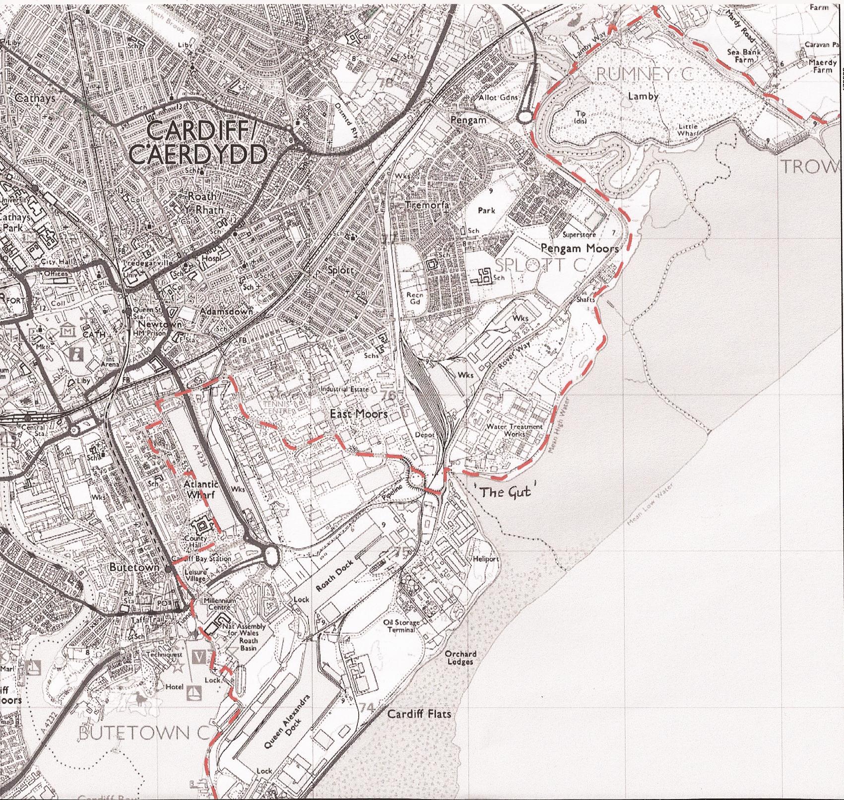 I have ambitious schemes for this part of Cardiff, which I will not bore you with now. Suffice to say they involve the protection and extension of the last remnant of the East Moors at Pengam, new trackways and intense tree-planting on the ‘frag tip’ metal mountain, and the imaginative conversion of the Tremorfa sewage treatment plant into a bio-fuel, bio-degradable Green temple. The Llwybr passes all these dubious delights before abruptly ending at “the Gut”. I have written about the Gut before on this blog, and from now on I’m removing those inverted commas. Let’s have the guts to call it what it is: Cardiff’s, ahem, exhaust pipe.