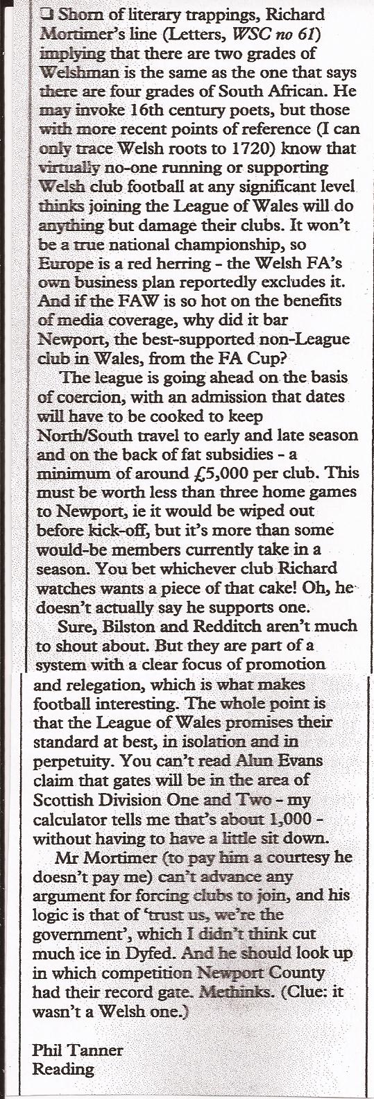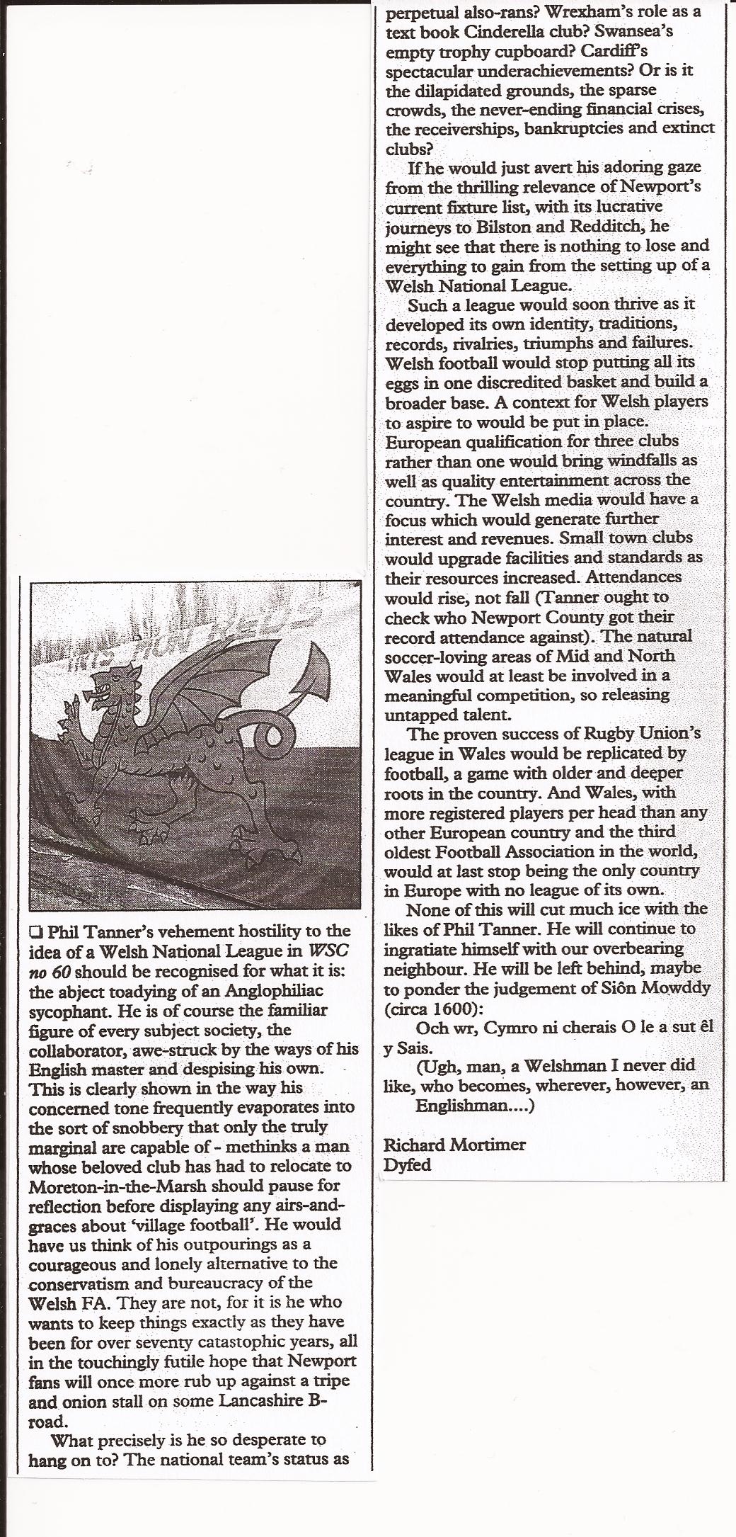 World-weary cynic Dic Mortimer a perennial optimist? I hear your mocking laughter, reader(s). But remember it takes a monumental optimism to keep on fighting for causes as profoundly minority, dissident and counter-intuitive as the WPL. It actually takes a child-like belief that, one day, the Baddies will be vanquished and the Goodies will win. And I’ve been doing it from even before the WPL’s birth as the League of Wales in August 1992. Below is a cutting from the letters page of footie mag When Saturday Comes, issue 61, March 1992 (it’s still going strong and has reached issue 307). Note, in those days I had not yet adopted my Cymrufied Dic nom-de-plume. Long aside coming up… What a good move that turned out to be! Google ‘dic’ and hit the space bar, and I’m second only to Dic Penderyn as the most famous Dic on the planet – I’ve pushed an Archdruid into third place! Google ‘richard’, on the other hand, and I’d be lost in the depths of the 280 billion suggestions. Right, where was I? Oh yes, here’s that letter in WSC and below it, my antagonist’s response in the next issue (no. 62).